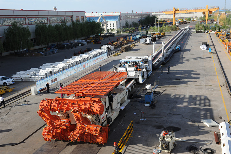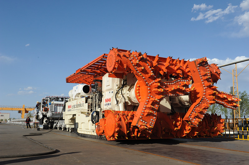 Based on the international advanced technology,NHI successfully developed the full-section coal road high efficiency boring machine_QMJ4260.The machine has multifunction of full-section, continuous cutting technology, automatic positioning, wireless remote control technology, fast loading and shipping, dust removing, airborne Roofbolter and shunting. It achieves coal road fast driving, long-distance remote control operation and significantly improves driving efficiency. With over 3000m footage per month, QMJ4260 boring machine achieves another technological leapfrogging in the field of coal driving.